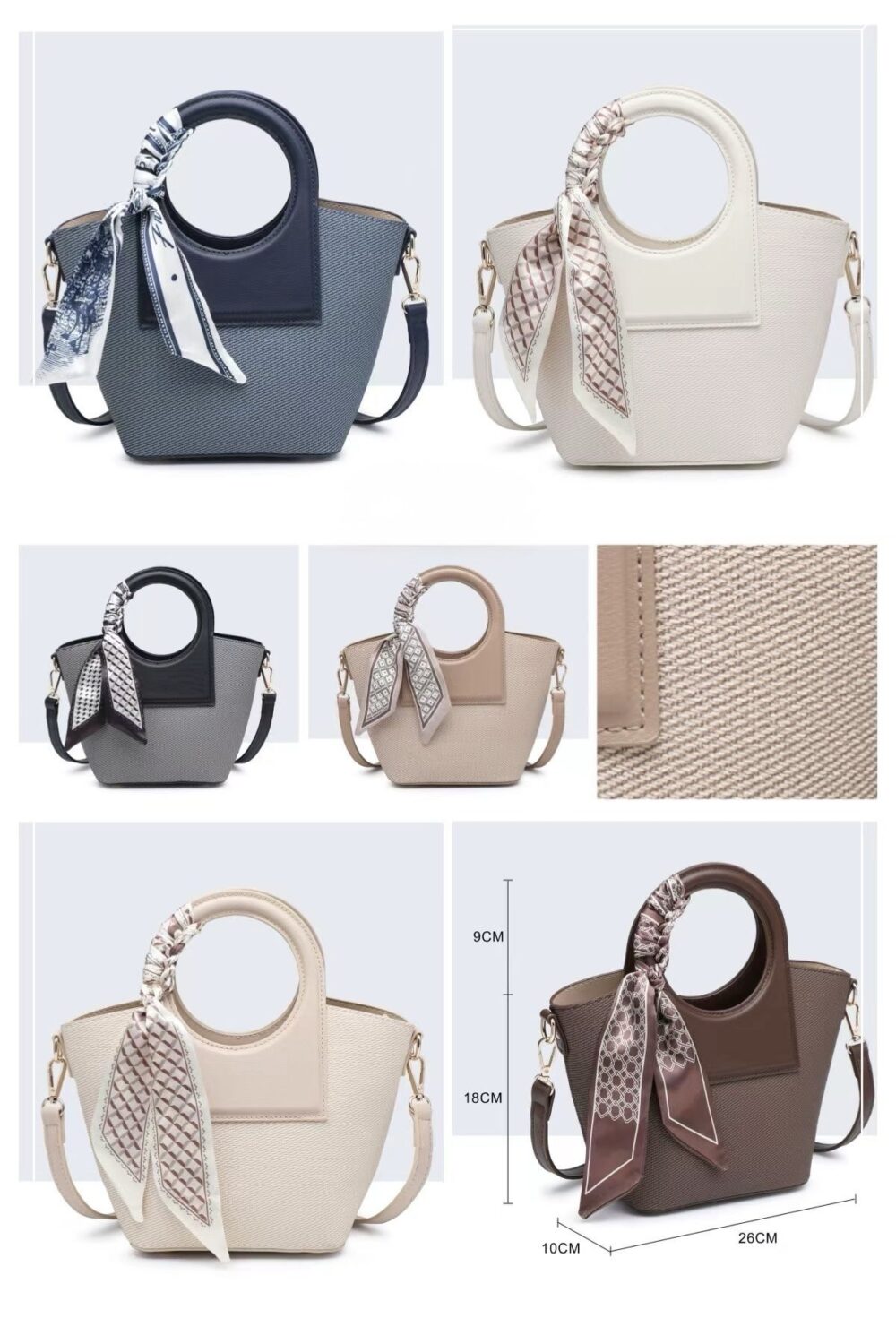 Eleva tu estilo con este sofisticado bolso de mano con asa circular, diseñado para mujeres que buscan un accesorio elegante y versátil. Su estructura compacta y su diseño minimalista se combinan con un delicado pañuelo decorativo, aportando un toque chic y distintivo a cualquier look.