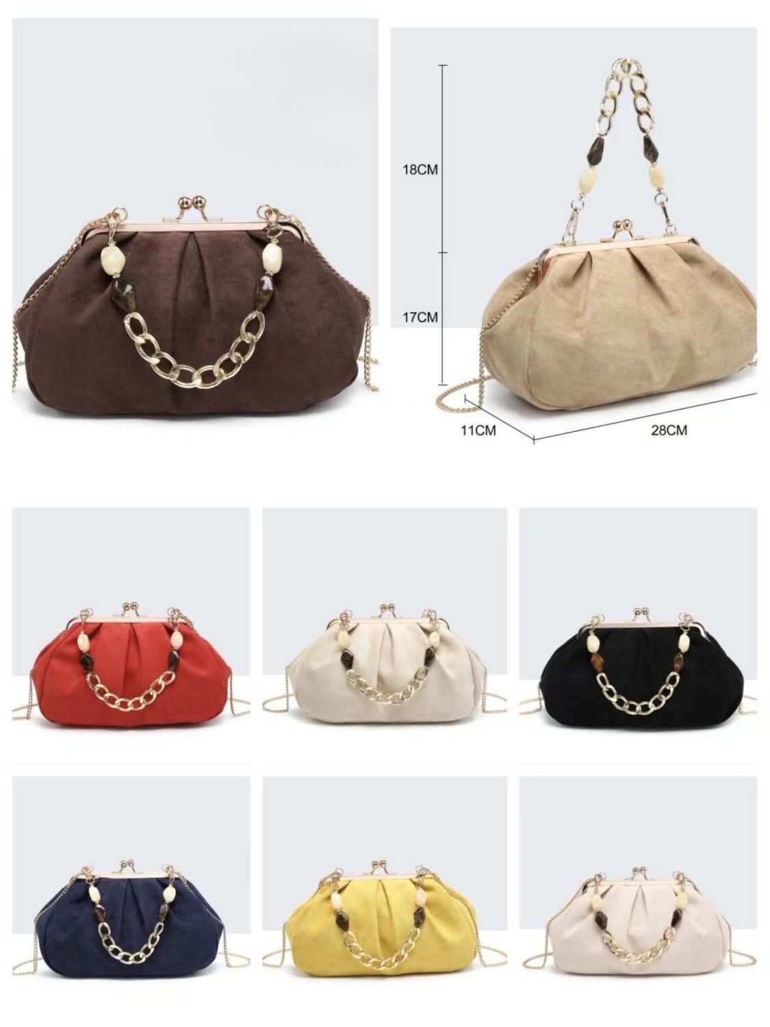 Bolso de estilo boquilla en material efecto ante, incluye cadena larga y asa corta con detalle de piedras.
