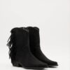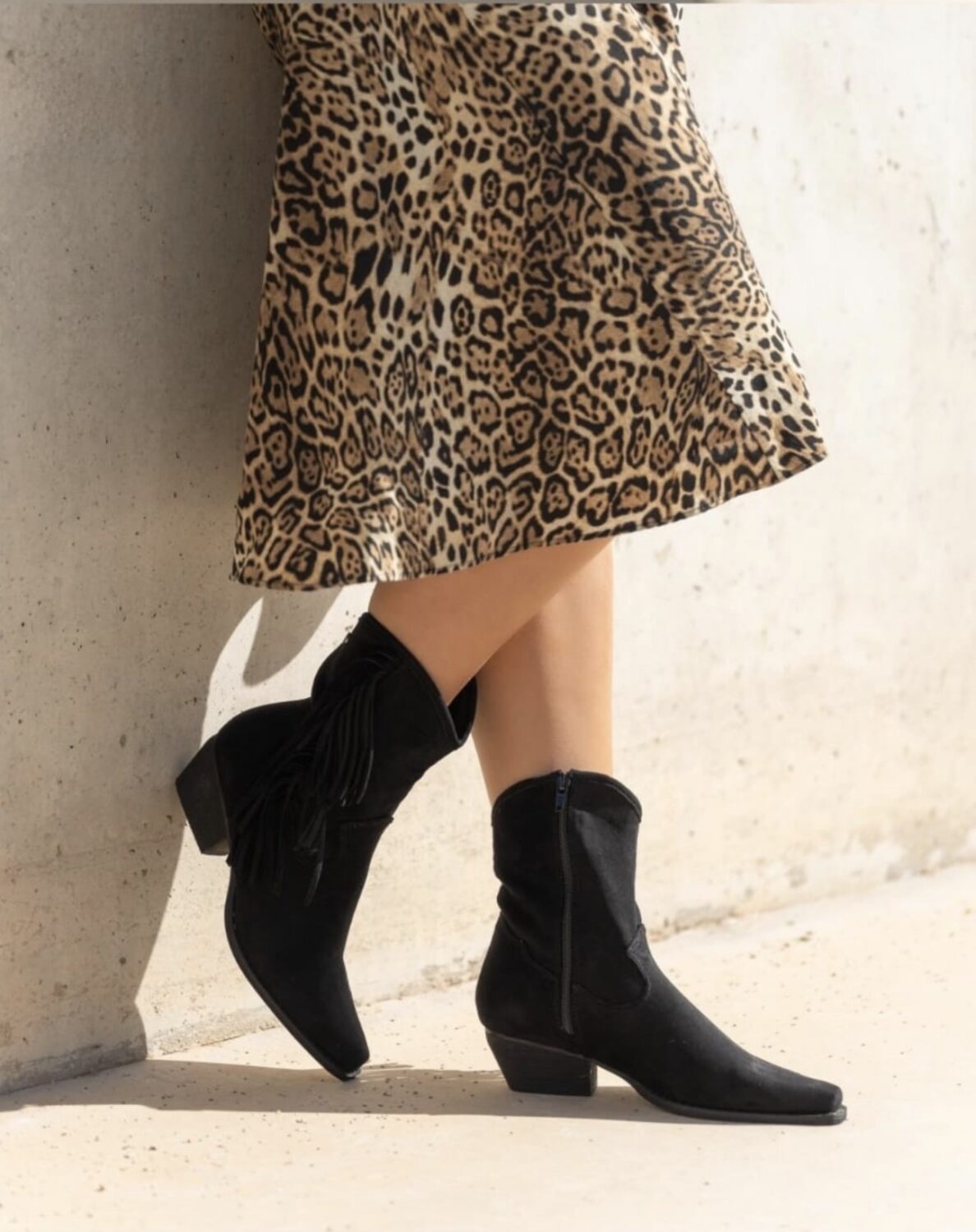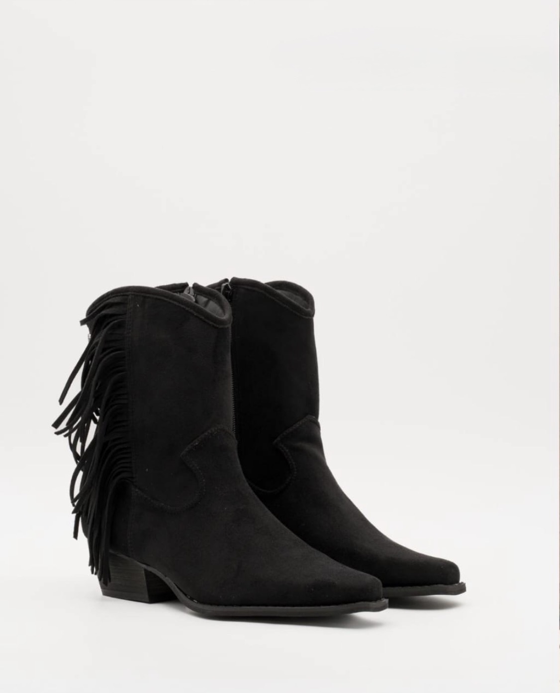 Botines de estilo Cowboy en textil efecto antelina con detalle de flecos en el lateral exterior.