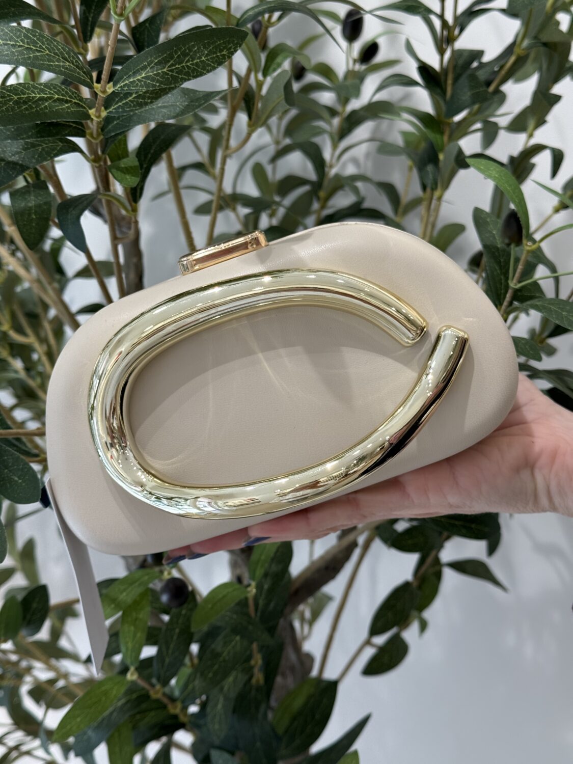 Eleva tu look con esta sofisticada cartera de vestir en color beige, diseñada para destacar en cualquier ocasión especial. Su estructura rígida y acabado tipo piel le aportan un estilo moderno y refinado, mientras que el elegante herraje metálico dorado en forma curva se convierte en el protagonista del diseño.