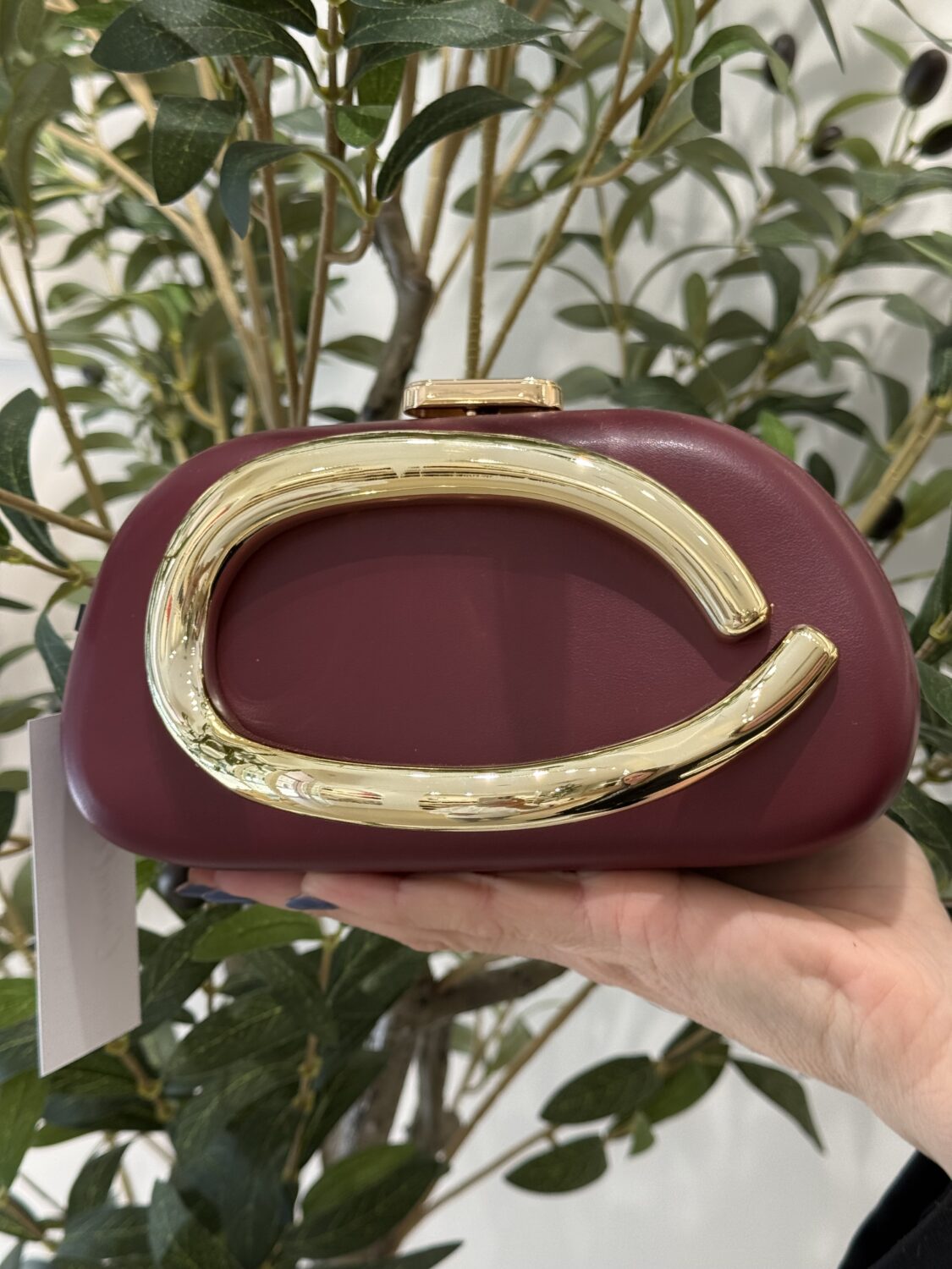 Eleva tu look con esta sofisticada cartera de vestir en color vino, diseñada para destacar en cualquier ocasión especial. Su estructura rígida y acabado tipo piel le aportan un estilo moderno y refinado, mientras que el elegante herraje metálico dorado en forma curva se convierte en el protagonista del diseño.