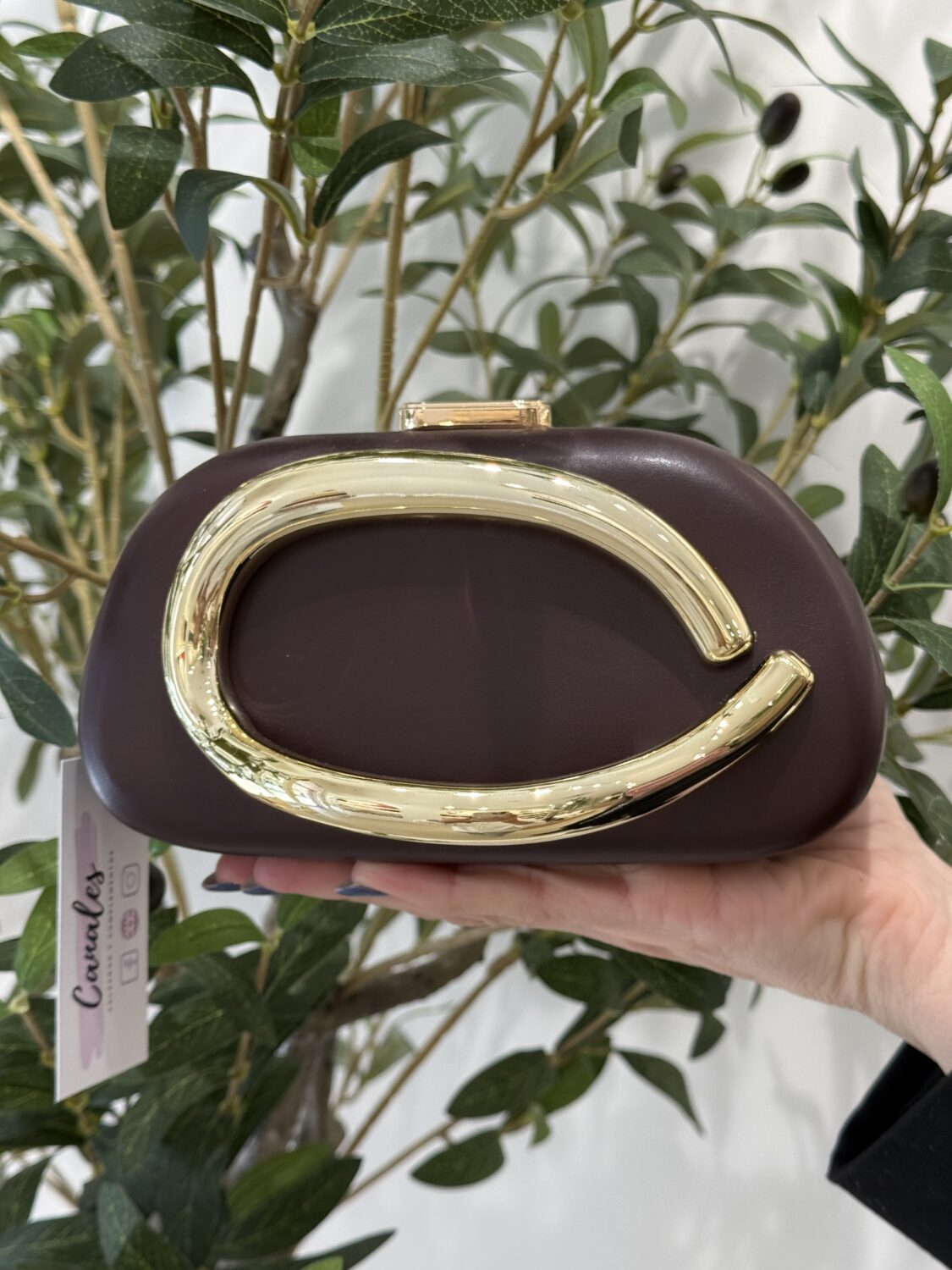Eleva tu look con esta sofisticada cartera de vestir en color marrón , diseñada para destacar en cualquier ocasión especial. Su estructura rígida y acabado tipo piel le aportan un estilo moderno y refinado, mientras que el elegante herraje metálico dorado en forma curva se convierte en el protagonista del diseño.