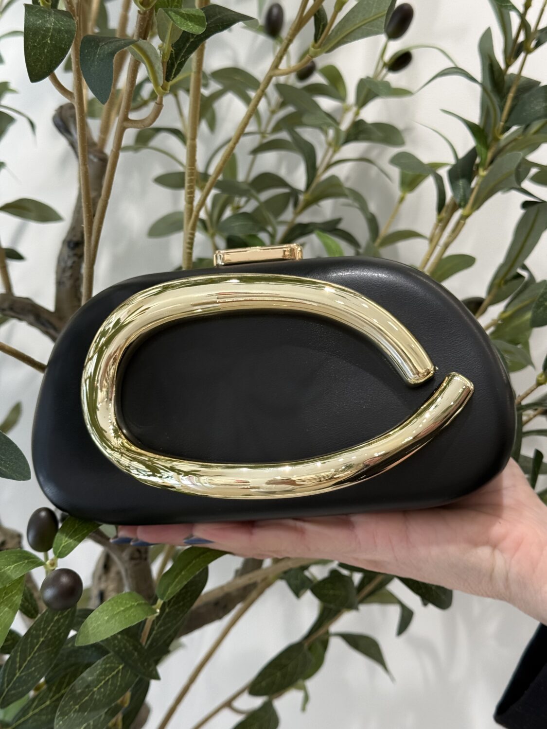Eleva tu look con esta sofisticada cartera de vestir en color negra, diseñada para destacar en cualquier ocasión especial. Su estructura rígida y acabado tipo piel le aportan un estilo moderno y refinado, mientras que el elegante herraje metálico dorado en forma curva se convierte en el protagonista del diseño.