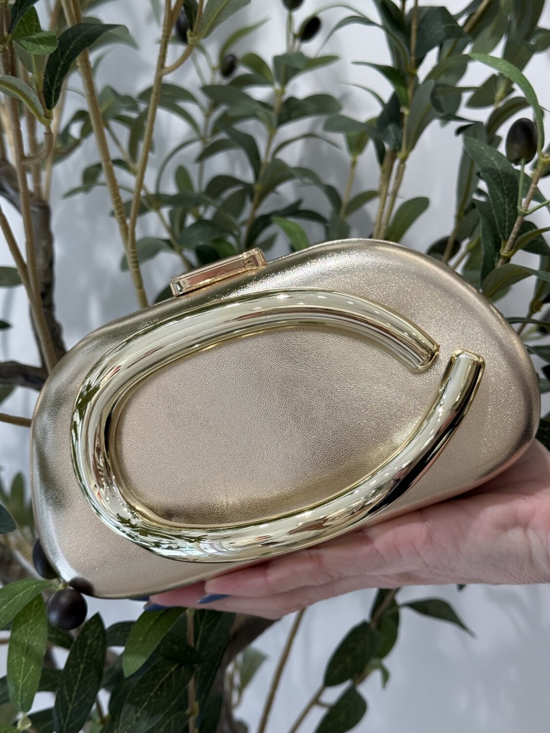 Eleva tu look con esta sofisticada cartera de vestir en color oro, diseñada para destacar en cualquier ocasión especial. Su estructura rígida y acabado tipo piel le aportan un estilo moderno y refinado, mientras que el elegante herraje metálico dorado en forma curva se convierte en el protagonista del diseño.
