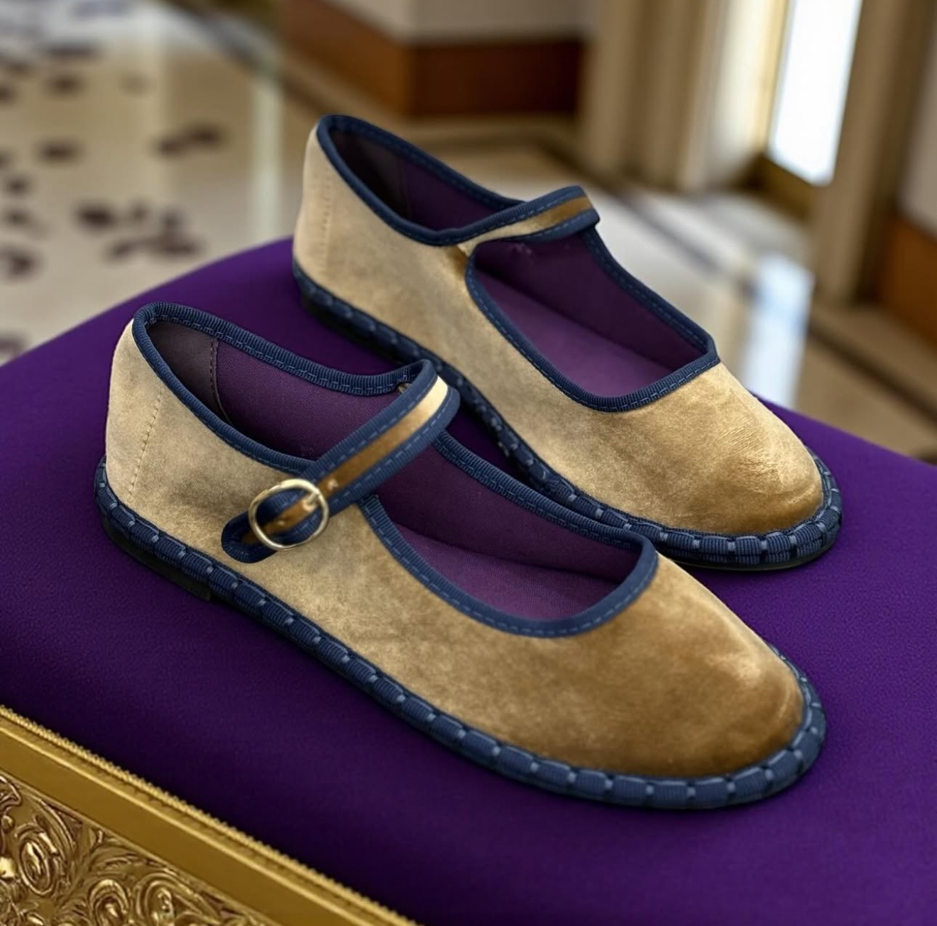 Bailarinas estilo Merceditas en tejido efecto antelina color taupe con detalle en los filos azul marino, que aportan una combinación muy bonita y original.