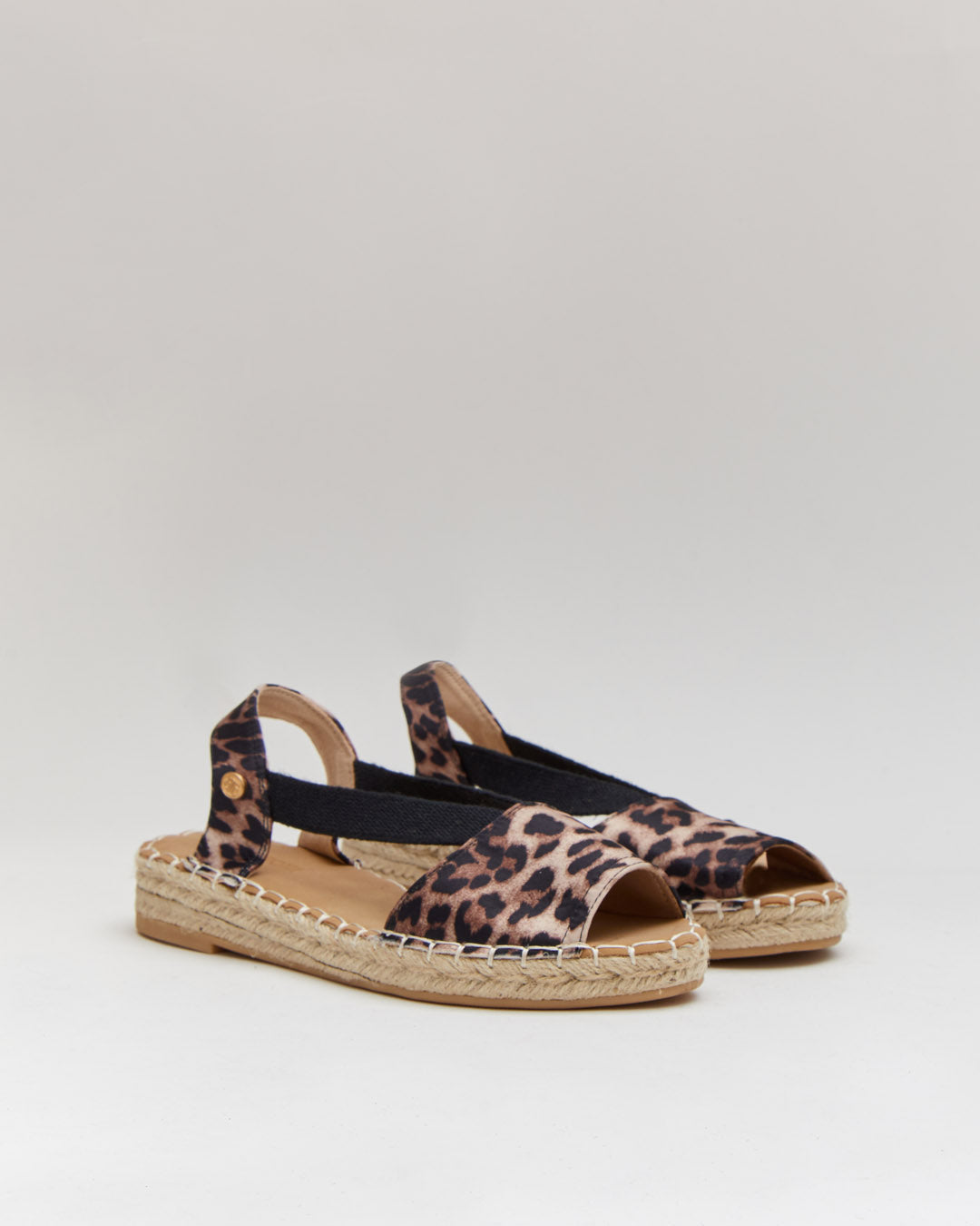 La suela tipo yute, ligera y flexible, añade un acabado natural y veraniego, ideal para caminar sin esfuerzo. El tejido en animal print leopardo convierte esta sandalia en una pieza clave para elevar cualquier outfit, desde los más casuales hasta los más sofisticados.