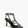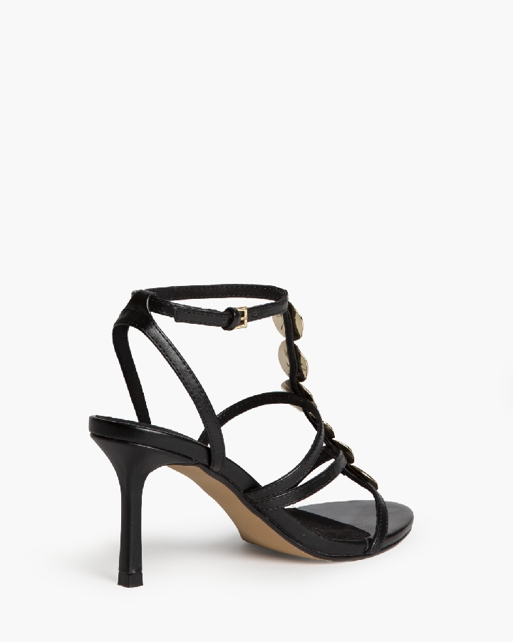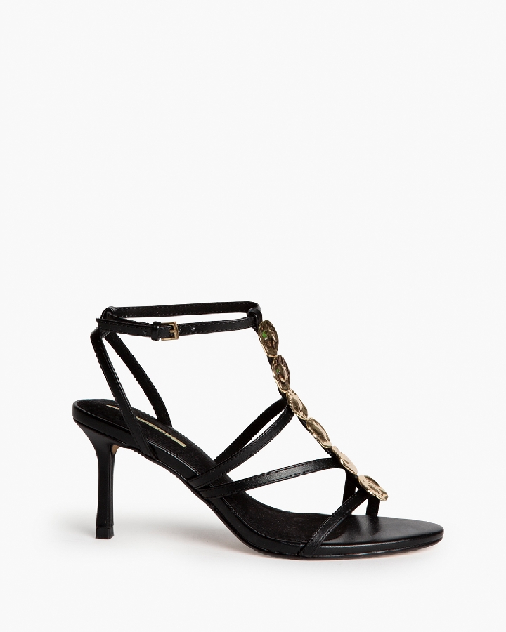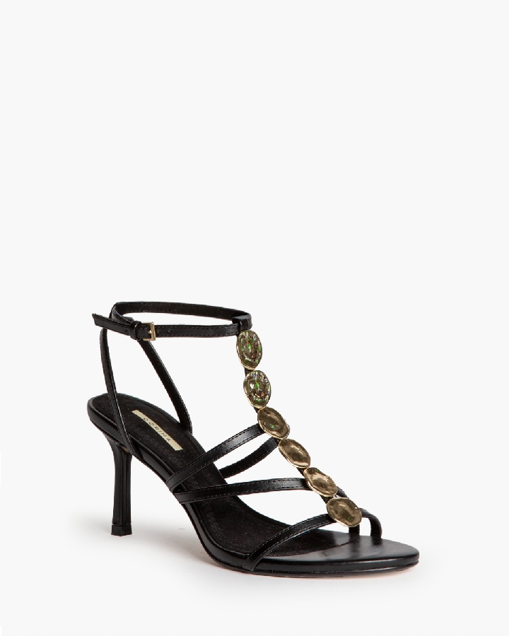 Sandalia negra de tacón medio con detalle dorado de la Colección Corina.