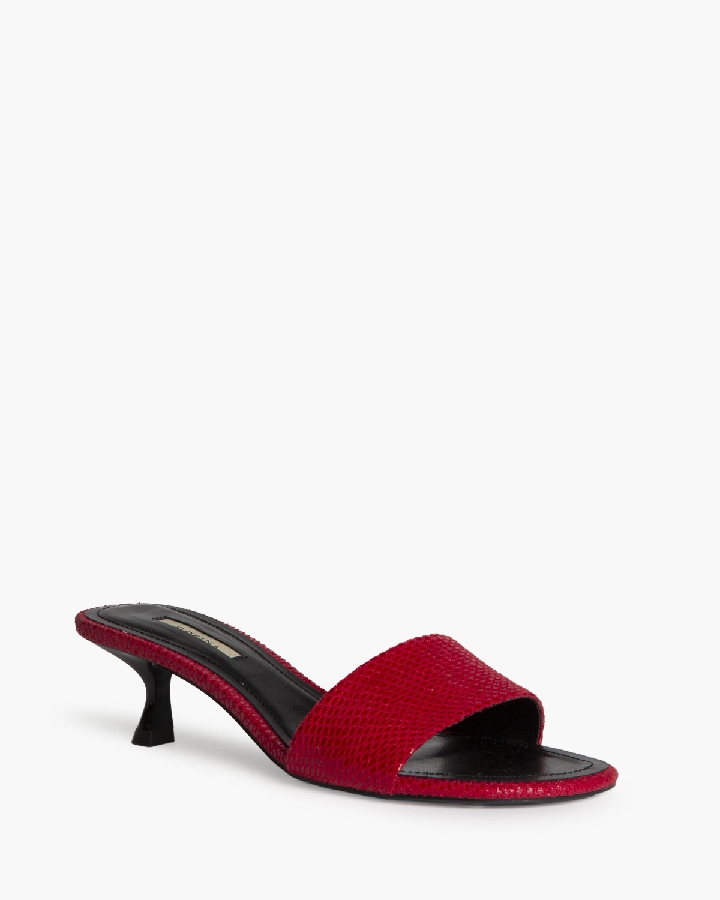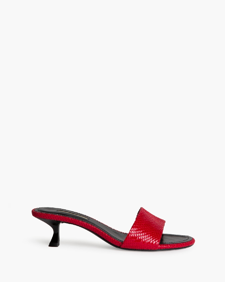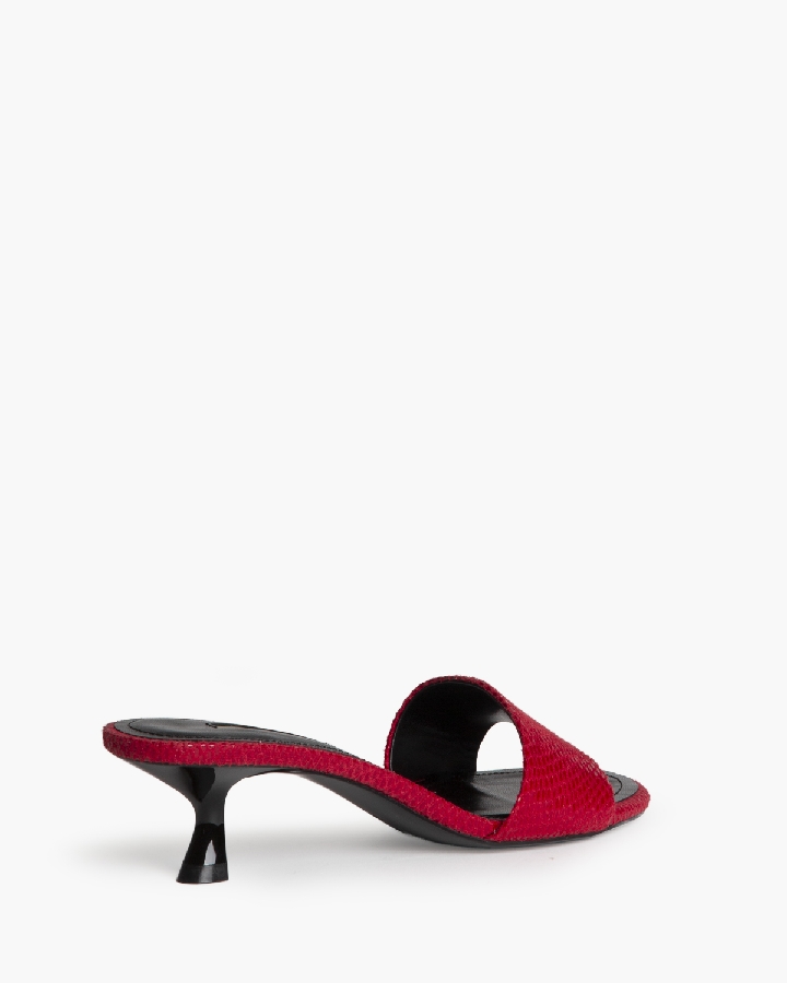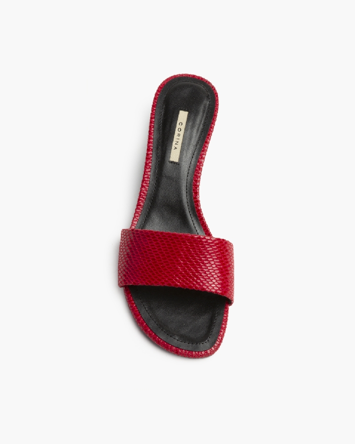 El acabado en color rojo intenso con textura efecto piel aporta personalidad y convierte esta sandalia en una pieza clave para elevar cualquier look, desde outfits casuales con jeans hasta vestidos más elegantes.