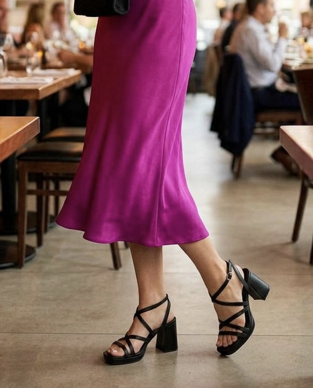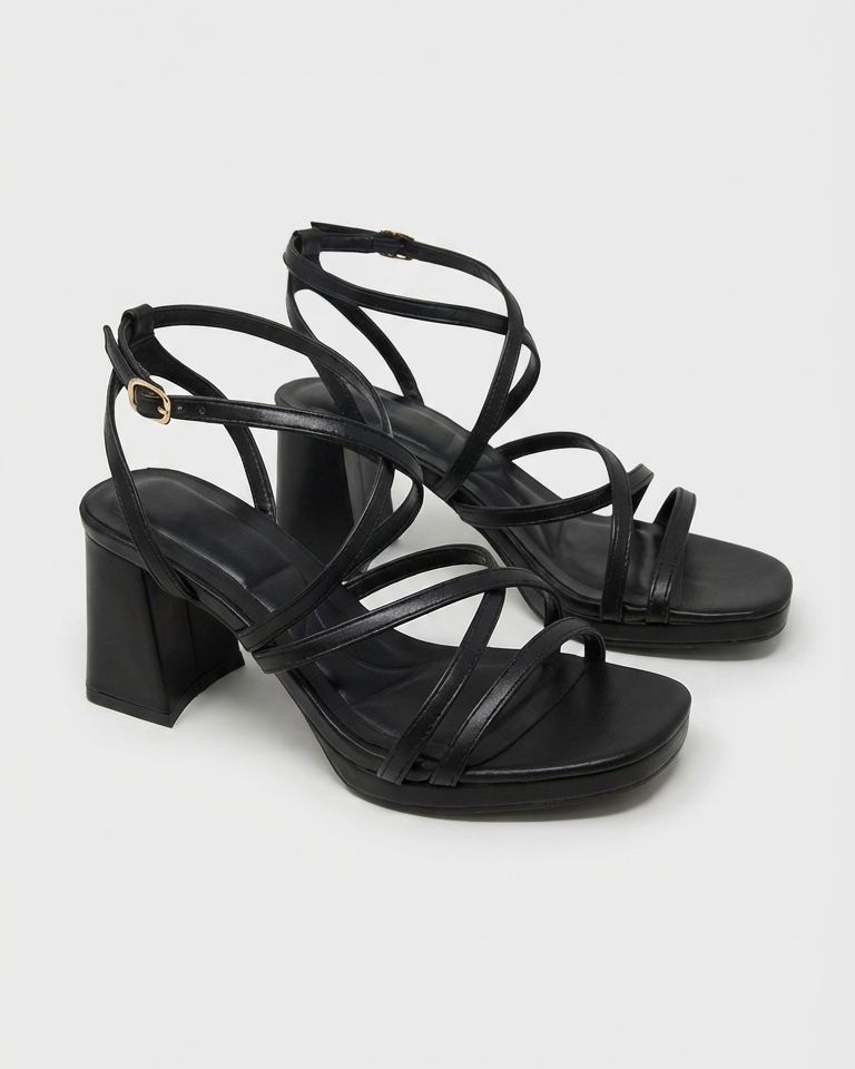 Descubre estas sandalias negras de tacón medio, diseñadas para ofrecer el equilibrio perfecto entre estilo y confort. Su acabado y sus tiras finas cruzadas aportan un toque sofisticado, ideal para eventos, fiestas o looks de invitada.
