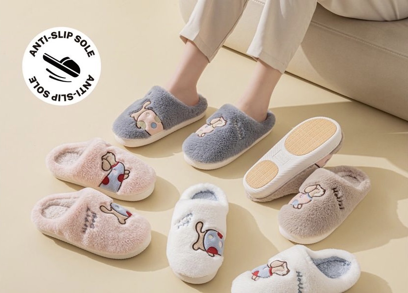 Zapatillas de casa en tejido de pelo suave con detalle de perro.