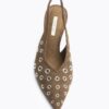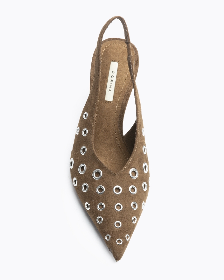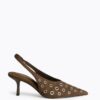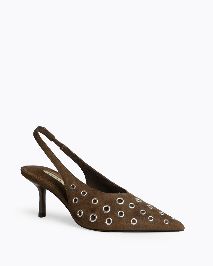 Zapato de estilo salón con un aire renovado, de tacón fino con detalles tipo arandelas metálicas que le dan un toque muy original y diferente.