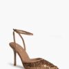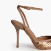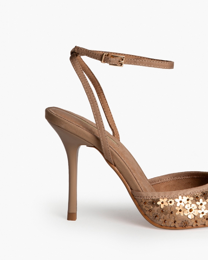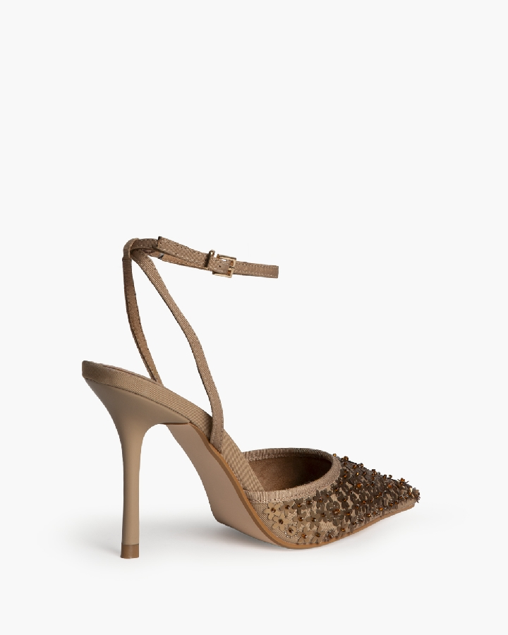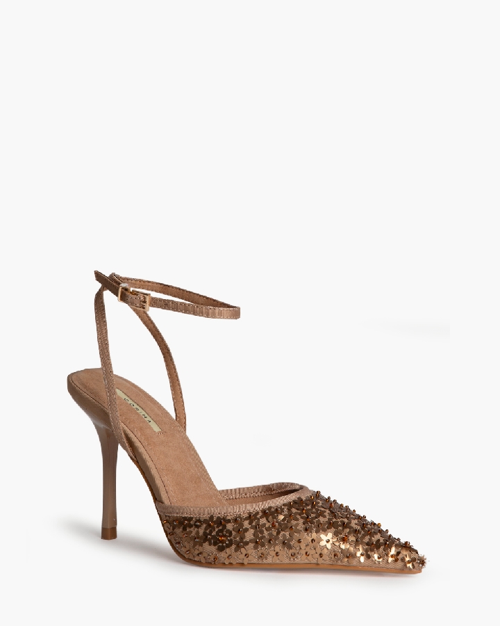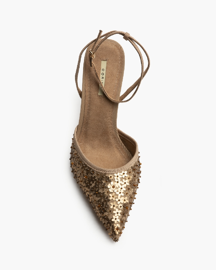 Zapato tipo stiletto de punta con original bordado a tono de lentejuelas.
